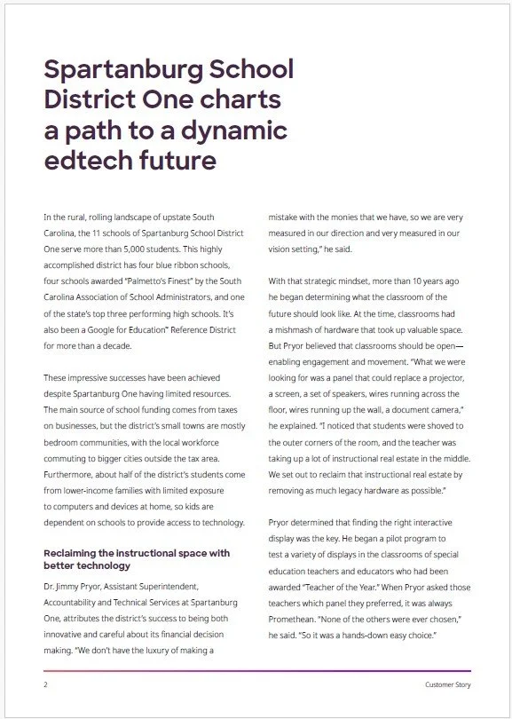 Senior copywriter and editorial lead for customer storytelling. I partnered with sales to select strong story candidates, then led the end-to-end editorial process: coordinating and conducting in-depth interviews with district leaders, IT teams, educators, and, at times, students; identifying a clear narrative throughline from extensive transcripts; and shaping each story through multiple rounds of writing and refinement. I managed review and approval with school and district stakeholders, collaborated with the design and web teams for publication, and ensured finished stories were shared across field marketing, company outreach, and sales enablement teams.